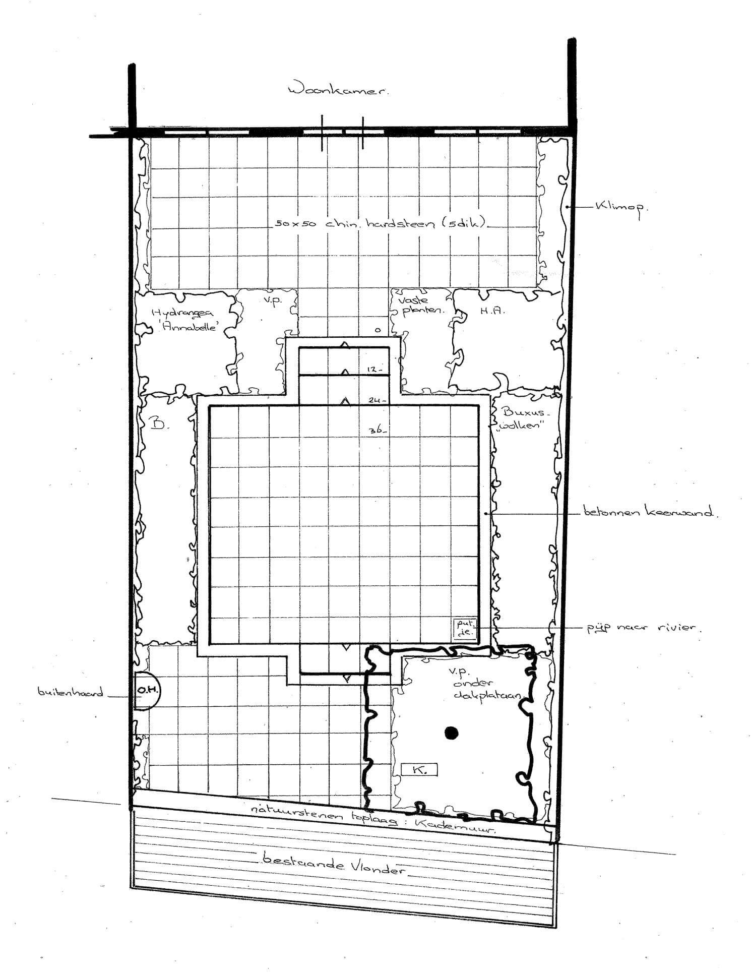 Om het onderhoud simpel te houden is het sortiment beplanting erg klein gehouden. Veel Buxus, Hortensia’s en wat vaste planten.